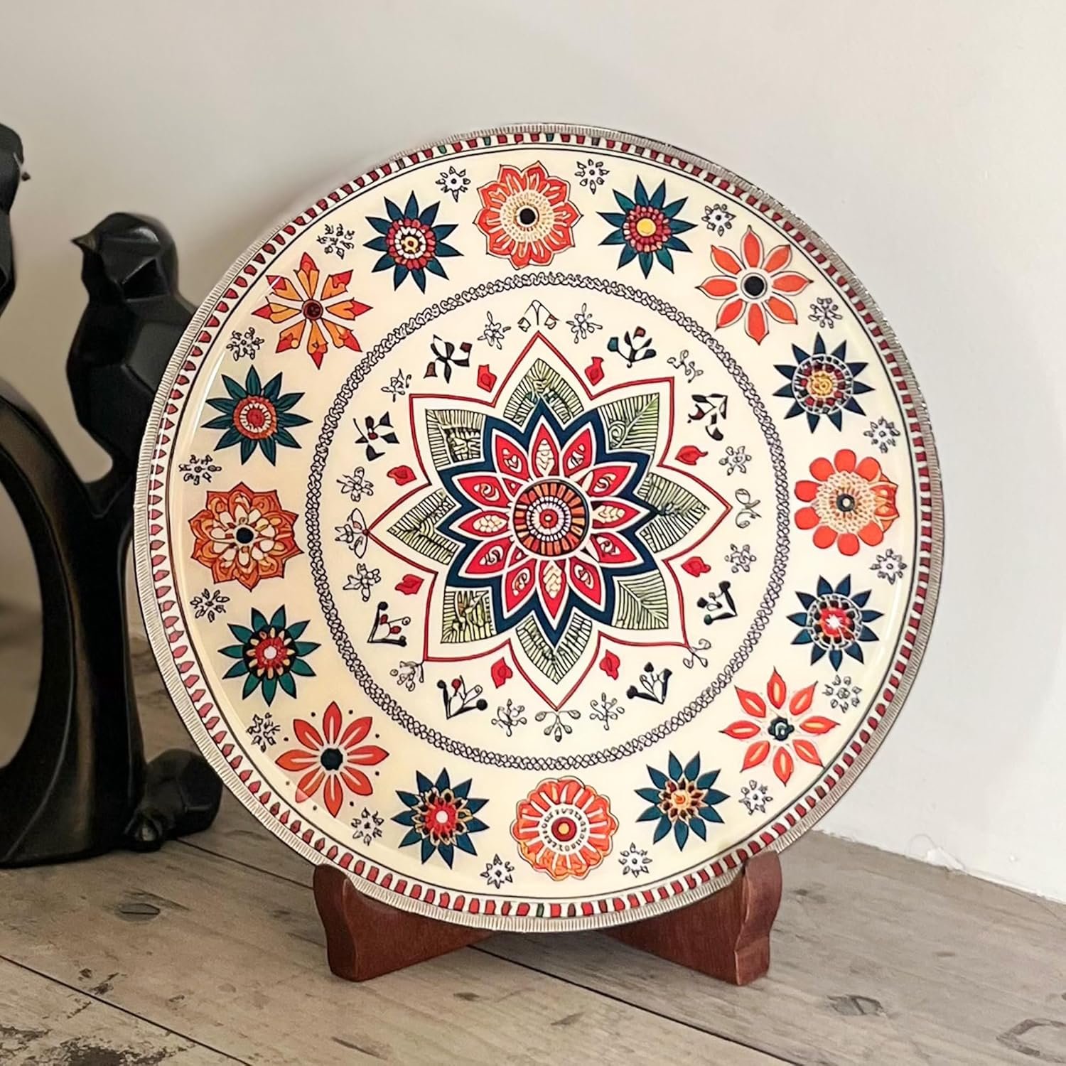 Amazon Basics Metal Vintage Mandala Showpiece Plate with Wooden Stand | 8 Inches | Mild Steel with Enamel Coating | Home & Office Desk Decor | Compact & Stylish Design | (21.5 x 20.5 x 5 cm)