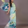 Immerse yourself in the calm and charm of summer with this handcrafted semi Murshidabad Bapta Silk saree in a soothing aqua tone. Adorned with floral prints in white, purple, and deep blue, this saree is a graceful blend of comfort and artistic flair.