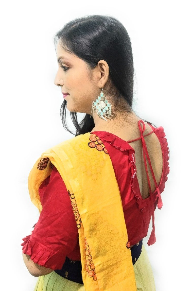 Experience elegance and comfort with this beautifully crafted red butter cotton silk blouse. Designed with a stylish back and hand-plated detailing, this blouse blends traditional charm with modern finesse. The soft and breathable butter cotton silk fabric ensures all-day comfort, while the non-padded construction offers a natural, effortless fit. Finished with a secure front hook closure, this blouse pairs perfectly with sarees for festive occasions, weddings, and everyday wear. A must-have addition to your wardrobe for a refined and graceful look.