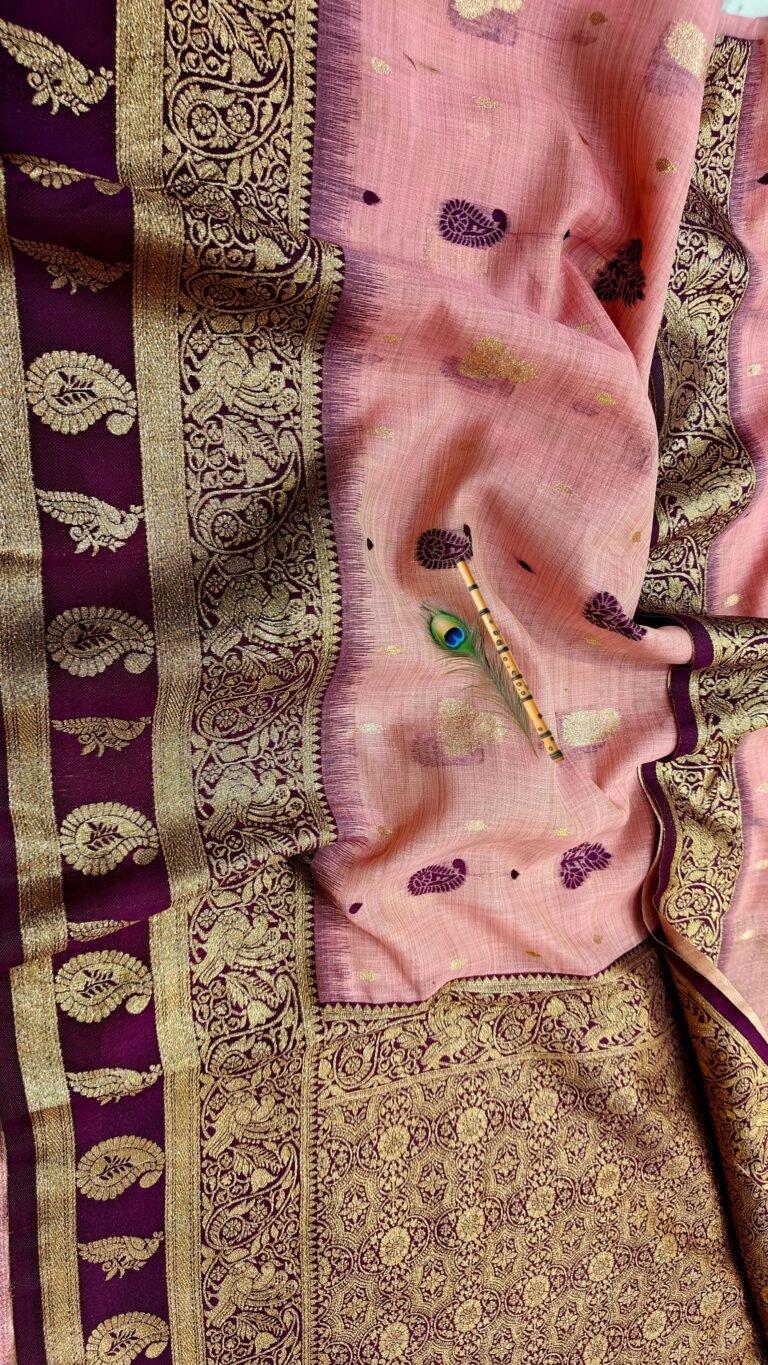 Thank you for reading this post, don't forget to subscribe!Adding depth and grandeur is the deep wine/plum contrast border, intricately woven with classic gold zari paisley and floral motifs. The richly adorned pallu further enhances the saree’s regal appeal, making it a perfect blend of sophistication and heritage craftsmanship.