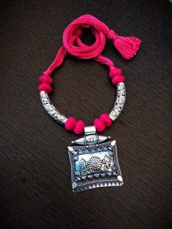 This handcrafted necklace blends the elegance of German Silver tubes with the rich texture of thread, creating a perfect fusion of tradition and contemporary style. The striking pendant serves as the centerpiece, adding a bold and artistic touch. Lightweight and versatile, this necklace is perfect for any occasion, effortlessly complementing both ethnic and modern outfits. A statement piece that exudes charm and sophistication