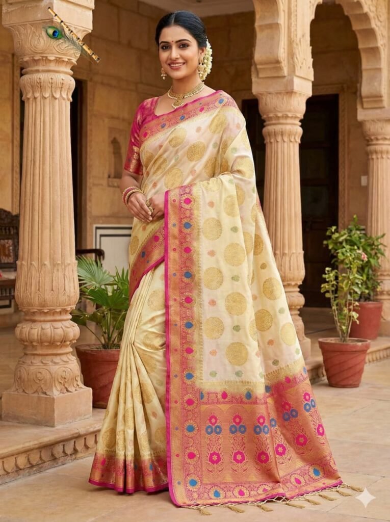 Thank you for reading this post, don't forget to subscribe!This saree features a soft and sophisticated cream base, beautifully decorated with rich golden zari circular butti motifs that add subtle shimmer and royal charm. The highlight of the ensemble is its vibrant pink contrast border, intricately woven with golden zari and detailed multicolor floral accents in pink and blue tones, creating a striking yet elegant finish.