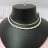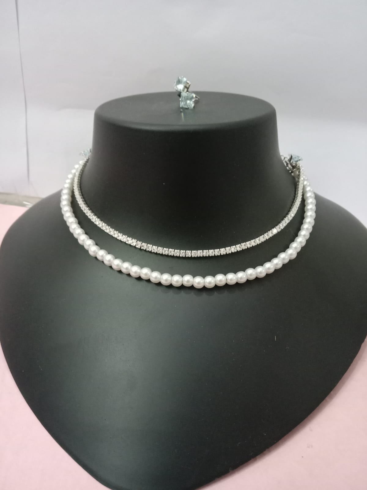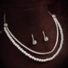 Add a touch of sophistication and elegance to your ensemble with this exquisite necklace and earring set. The beautifully crafted two-tier necklace features a combination of lustrous pearls and sparkling diamond-studded chains, creating a stunning contrast that is perfect for formal occasions or evening events. The matching earrings, set with brilliant square-cut diamonds, complete the look with a graceful, timeless appeal.