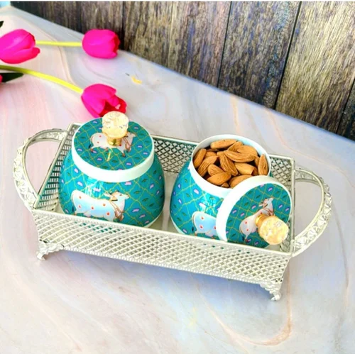 German Silver Rectangle Tray With Two Dry Fruits Metal Pitchwai Jars