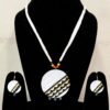 Elevate your ethnic style with this elegant handcrafted terracotta jewelry set, designed to make a subtle yet striking statement. The set features a round pendant with a sophisticated hand-painted design in monochrome shades, accented with black, yellow, and fine artistic detailing. The clean white base beautifully contrasts with the intricate patterns, giving it a modern artistic appeal.