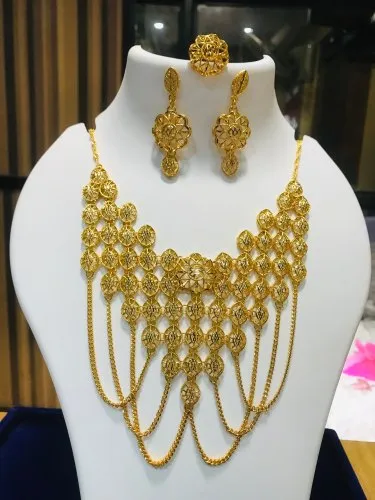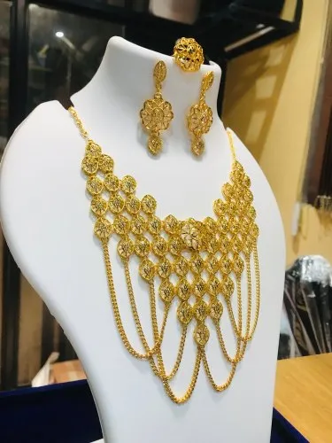 Type :- siddiqui gold plated choker necklace setnet quantity :- 1 unitcontains :- 1 necklace + 1 pair of earring + adjustable size finger ring