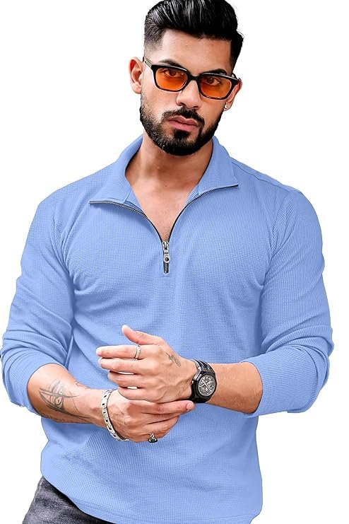 KAJARU Men’s Polyester Blend T Shirt with Spread Collar Neck Line Zipper Closure Full Sleeves Solid Pattern Regular Fit and Standard Length