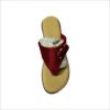 This is a stylish ladies’ designer sandal featuring a flat sole in a beige shade for comfort and everyday wear. The sandal has a broad red fabric strap across the upper side, enhanced with a golden ring detail for a touch of elegance. The inner side of the strap is lightly cushioned, providing both durability and comfort. The open-toe design makes it perfect for casual outings, ethnic wear, or festive occasions.