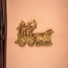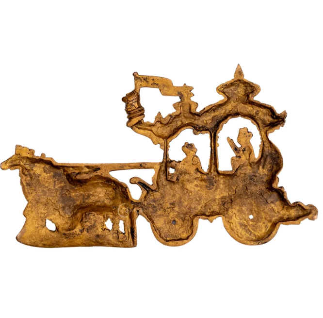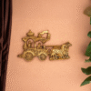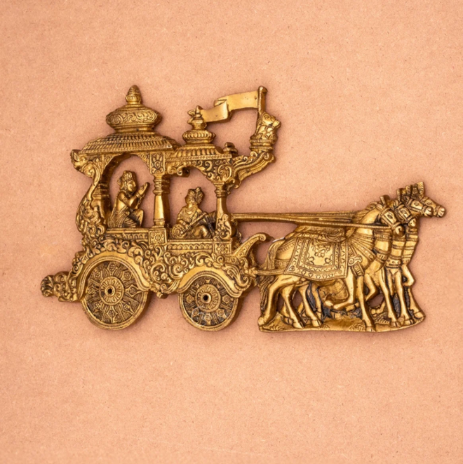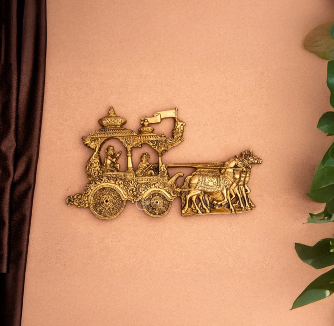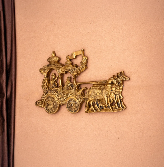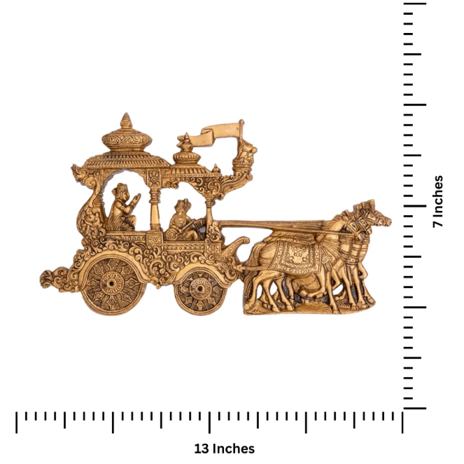 This is a detailed brass sculpture depicting a scene from the Mahabharata, specifically the ‘Rath’ or chariot. The piece portrays a two-wheeled chariot, intricately decorated with carvings and a canopy. Seated within the chariot are two figures, one of whom is Lord Krishna, depicted as the charioteer, and the other is Arjuna, the warrior. The chariot is being pulled by two horses, which are also elaborately detailed, complete with harnesses and saddle decorations. A flag is shown mounted on the chariot. The entire sculpture is made of brass with a matte gold finish, giving it an antique and regal appearance. The image includes a ruler to indicate its dimensions, showing it to be approximately 13 inches in length and 7 inches in height.