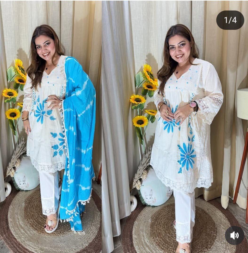 Pure cotton SHIFLLY+lino fabric party wear dress with shiffon lahariya dupatta sets