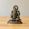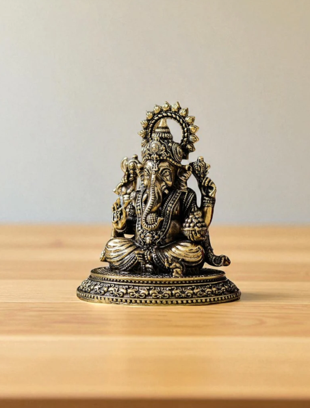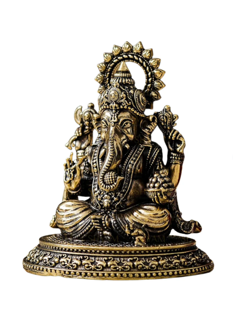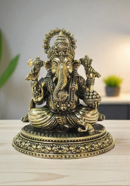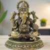 This stunning image features a meticulously crafted Superfine Brass statue of Lord Ganesha, exuding an aura of serene divinity. The statue has a deep, rich patina that gives it an antique, timeless quality, highlighting the exceptional detail of the metalwork.