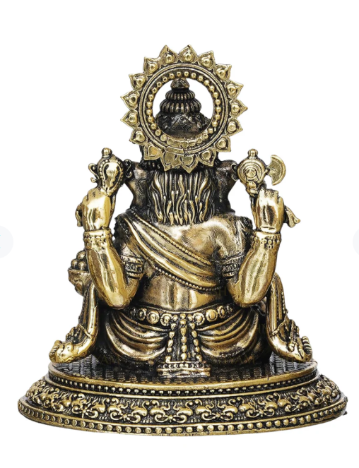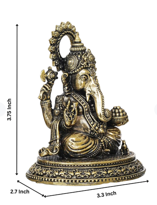 Thank you for reading this post, don't forget to subscribe!Ganesha is depicted in a traditional seated posture, with his legs crossed in a meditative pose. He is shown with four arms, a common representation symbolizing his vast powers. In his lower right hand, he holds a bowl overflowing with modaks, his favorite sweet, while his upper right hand holds an ankusha (elephant goad). His upper left hand holds a paasha (noose), and his lower left hand is raised in a gesture of blessing or offering.