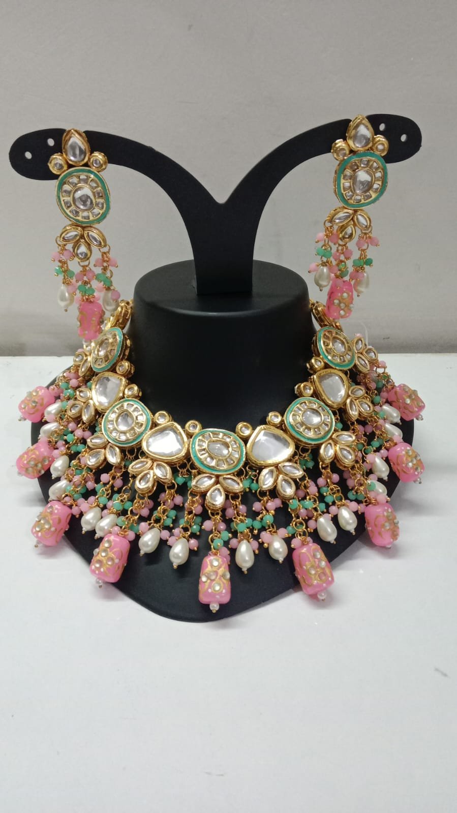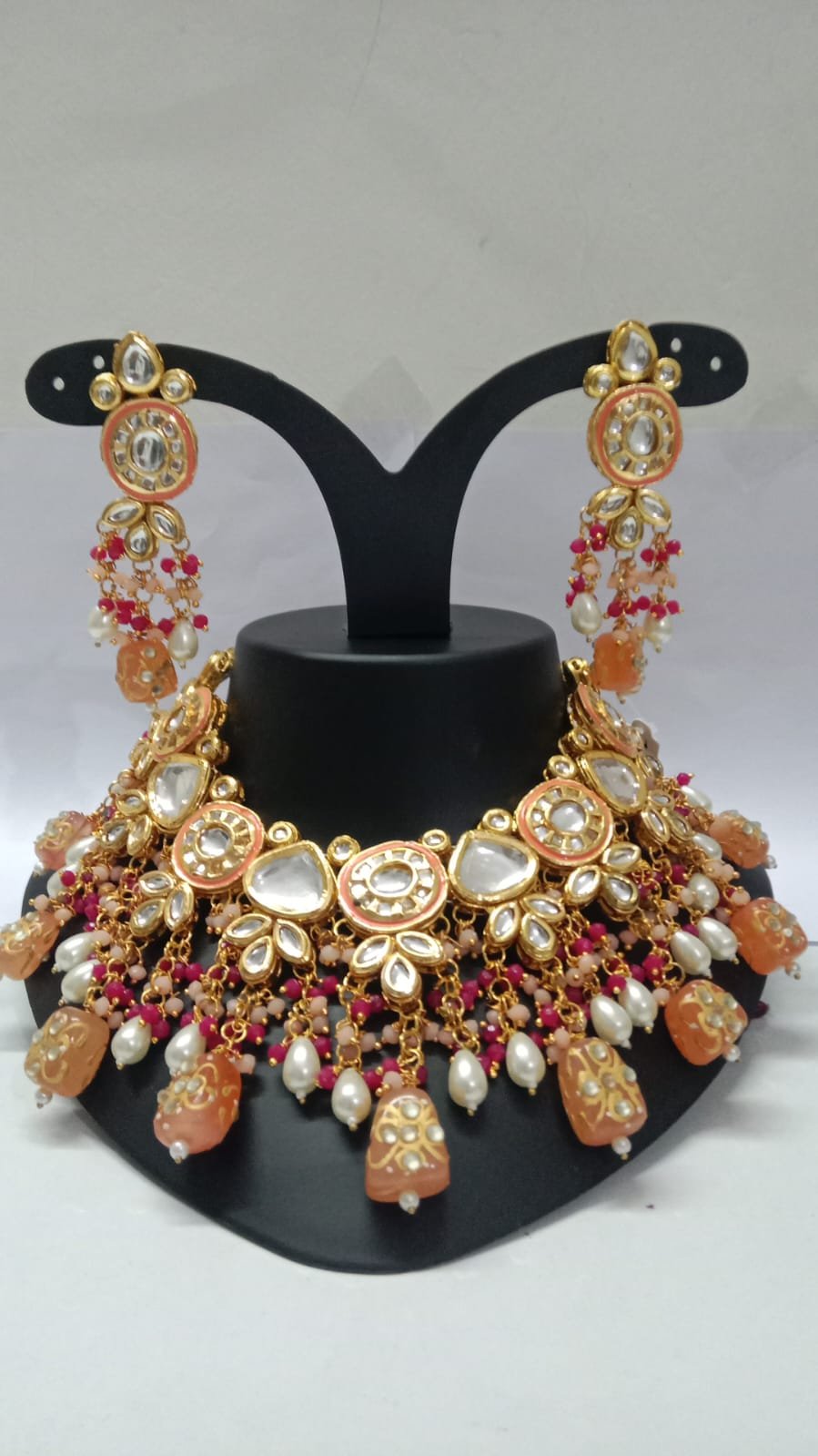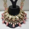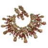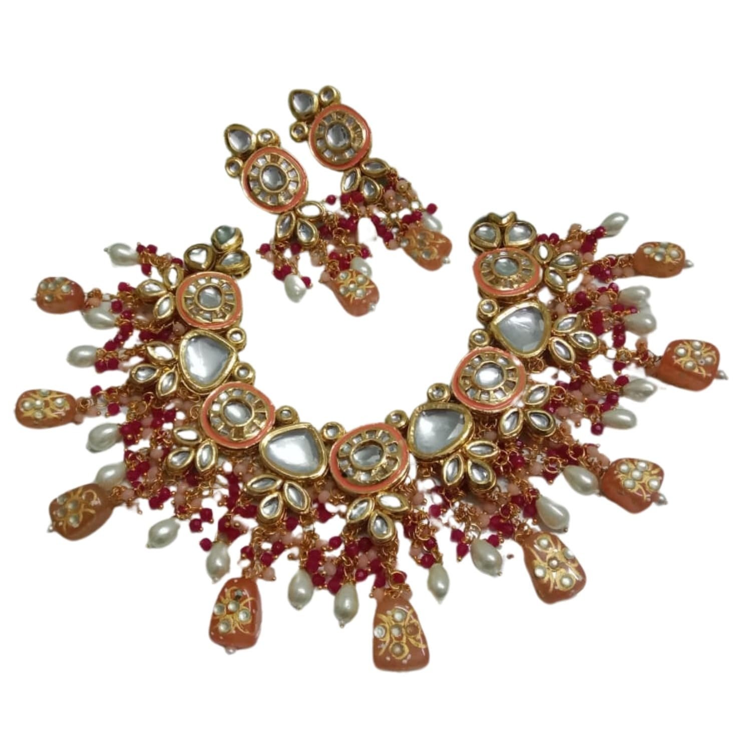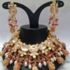 The set includes a pair of matching Kundan earrings that feature the same exquisite detailing, with colorful beadwork and pearl drops that complete the regal look. The elegant design of this necklace set makes it a timeless addition to your jewelry collection, radiating charm and cultural richness.